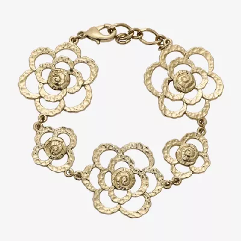 1928 Gold Tone Hammered Womens Flower 7 Inch Link Bracelet