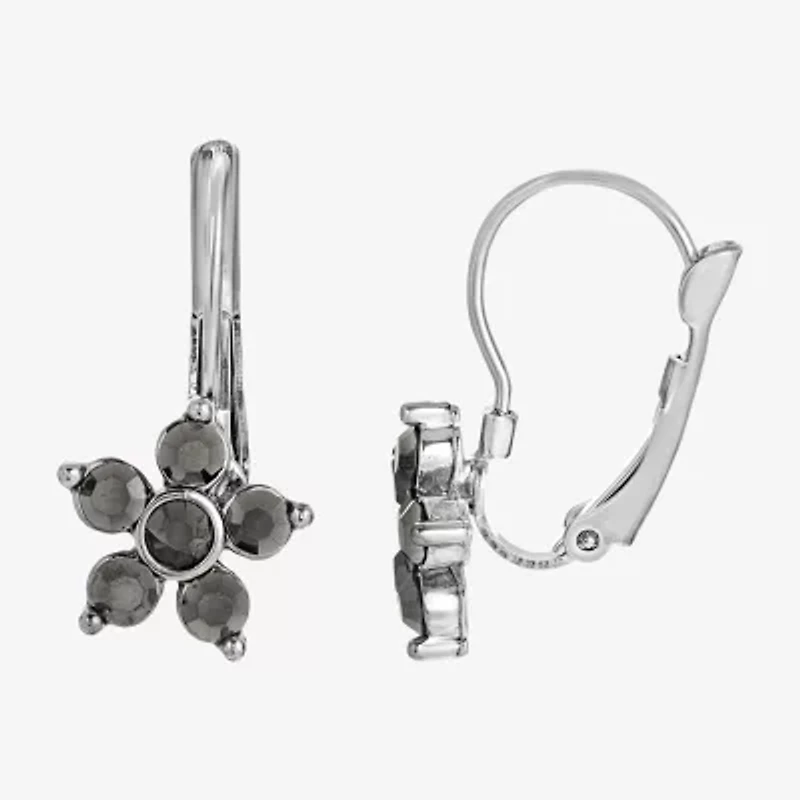 Petite floral designed lever back earrings featuring round hematite crystals on a silver tone frame.