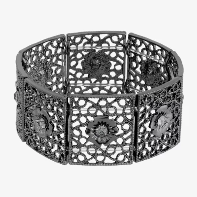 This stunning bracelet features square intricate filigree panels with sparkling crystals all around. A beautiful piece to accessorize any outfit.