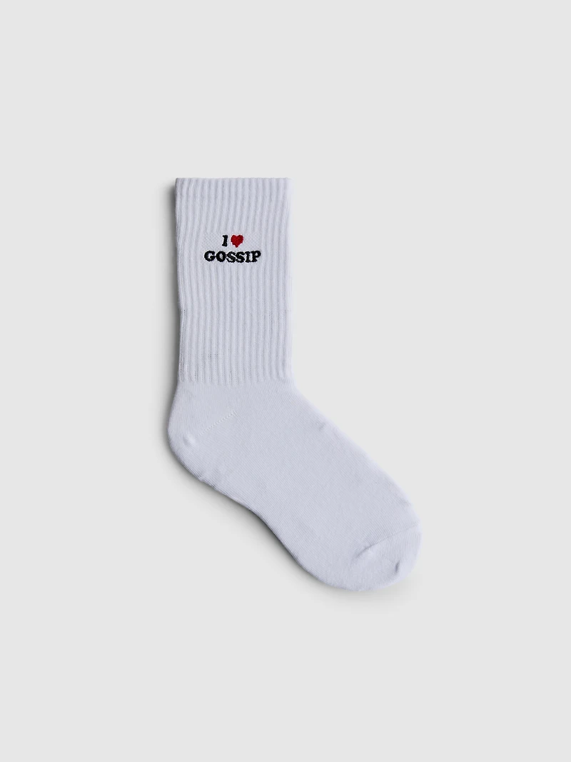 Love gossip? We have the sock for you! In a ribbed cotton blend, these crew socks have a gossip girl embroidery