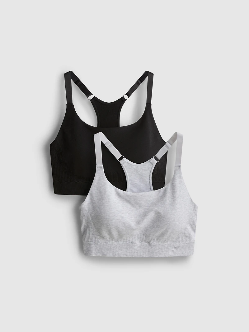 A pack of 2 seamless sports bras with racerback, adjustable straps, and a supportive underband