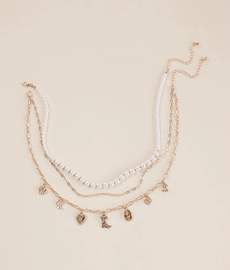 Tiered charm necklace length measures 17" Faux pearl necklace length measures 17 1/2"