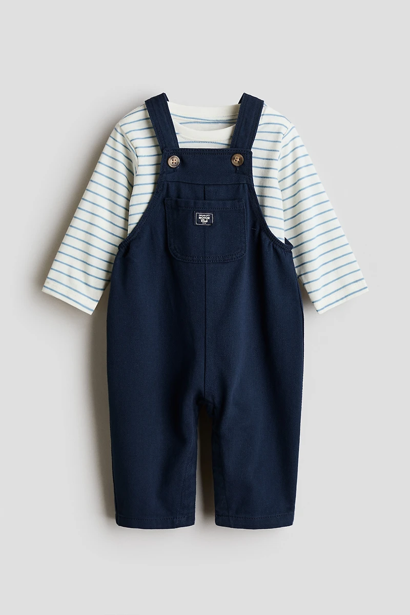 Set in cotton with overalls in twill and a shirt in soft jersey. Overalls with button-front shoulder straps, a square neckline, a bib pocket, covered elastic at midsection sides, and concealed snap fasteners along legs for easy changing (sizes 12M–4Y without leg fasteners). Shirt with long sleeves and a ribbed round neck with snap fasteners on one shoulder (sizes 12M–4Y without neck fasteners).