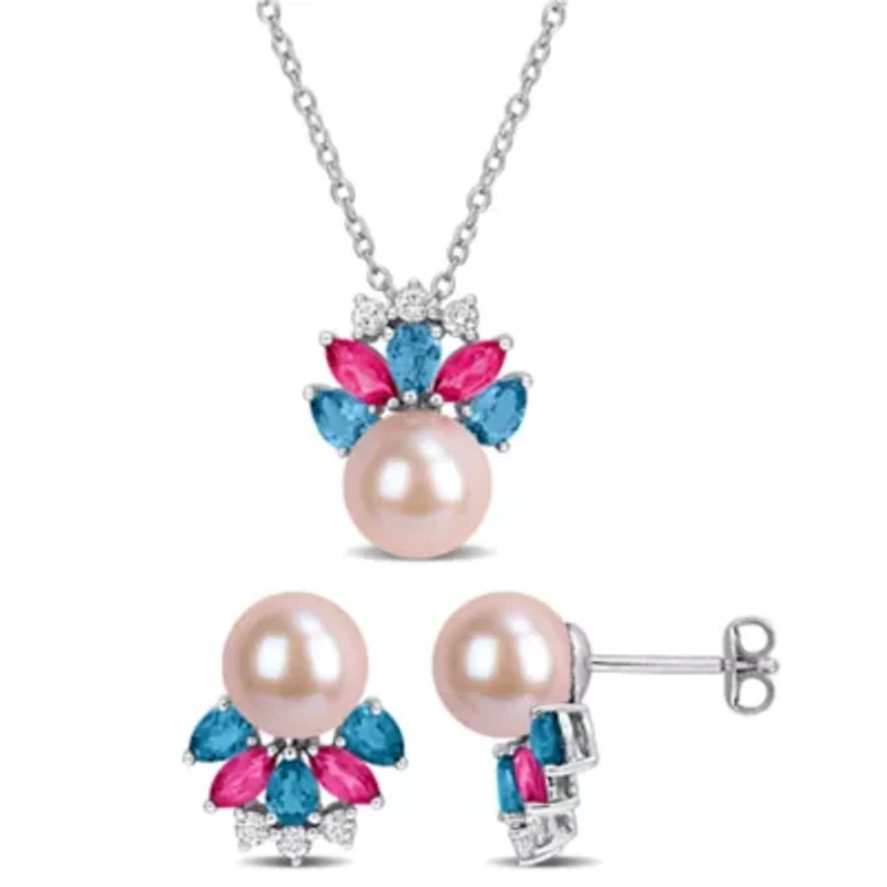 Radiate elegance with this pink cultured freshwater pearl and pink, London blue, and white topaz drop earrings and pendant set. Set in polished sterling silver, the lustrous pearls and sparkling gemstones create a harmonious, radiant shimmer. The coordinated pendant and earrings add sophistication and charm to any outfit, perfect for both everyday wear and special occasions. A timeless set that embodies style, grace, and refined beauty. 2 Post back, Lobster closure, 9 sky blue topaz, 6 pink topaz, 9 white topaz Polished finish Prong setting Warranty available, 60 days Thailand Imported Product Specifications 17 3.13 ct. t.g.w. sky blue topaz, pink topaz, white topaz Material & Care Sterling Silver Metal, Sterling silver Clean with a soft cloth.