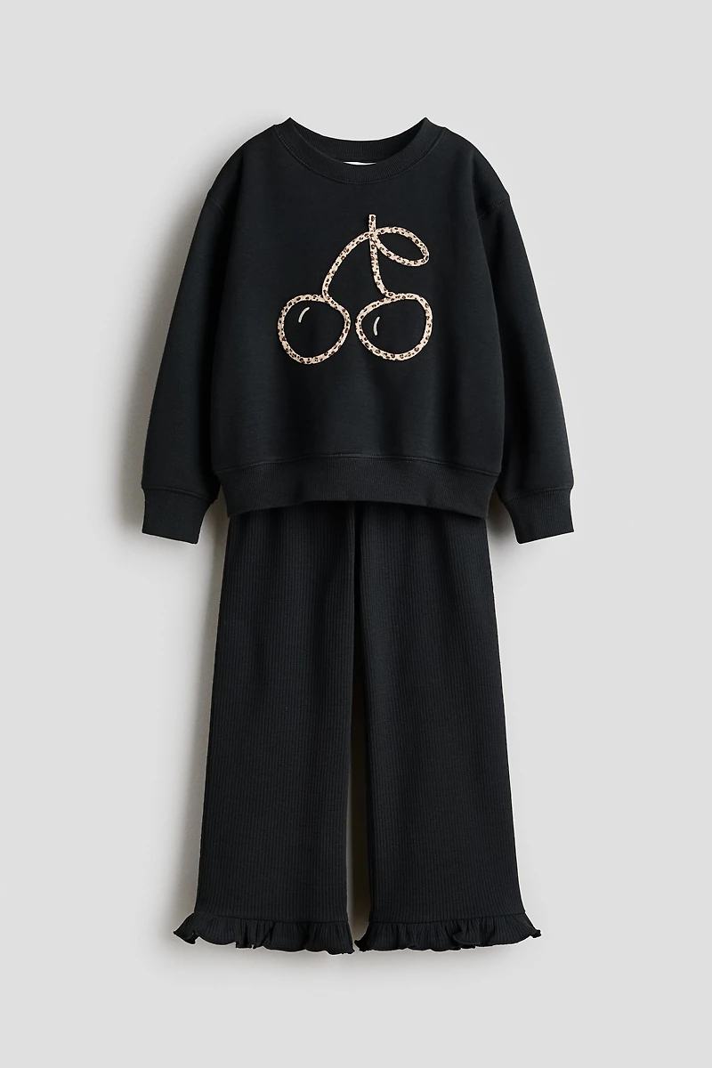 Set with a sweatshirt with a soft, brushed inside and pants in waffled cotton jersey, both with motif. Sweatshirt with a round neckline, dropped shoulders, and ribbing at neckline, cuffs, and hem. Pants with ruffle trim and covered elastic at waistband and ruffle-trimmed hems.