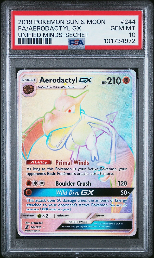 2019 Pokemon Sun & Moon Unified Minds 244 Full Art/aerodactyl Gx Secret PSA 10