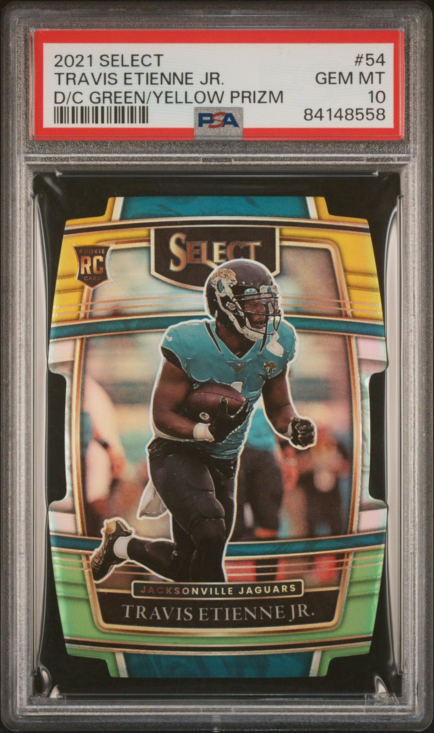 2021 Panini Select 54 Travis Etienne Jr. Die-cut Green/yellow Prizm PSA 102021 Panini Select 54 Travis Etienne Jr. Die-cut Green/yellow Prizm PSA 10