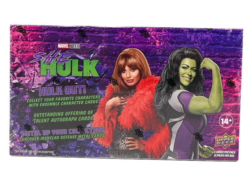HULK OUT! Upper Decks present Marvel Studios' She-Hulk trading cards! Collect an 81-Card Base Set along with themed insert cards, low numbered parallel cards, actate cards, metal cards and a variety of talent autograph cards.