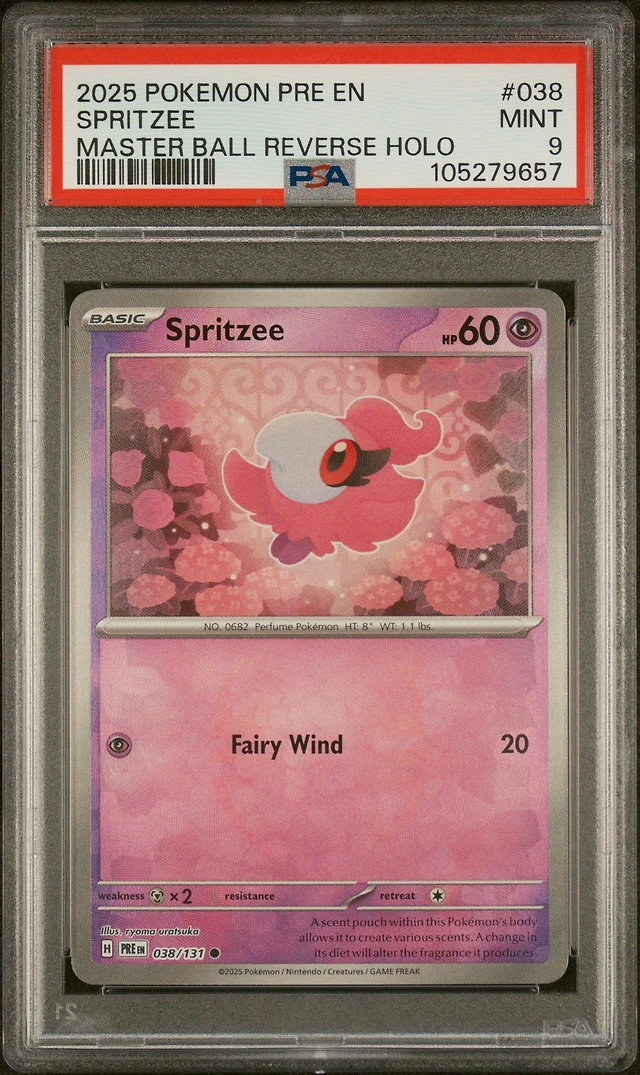 2025 Pokemon Pre En-prismatic Evolutions 038 Spritzee Master Ball Reverse Holo PSA