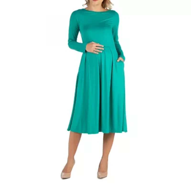 This 24seven women's maternity fit and flare dress is a style you'll feel chic and comfortable in. Made from a soft stretch-knit, this easy pullover midi-length style has a classic bateau neckline and long sleeves. Wear it with ballet flats or sandals.