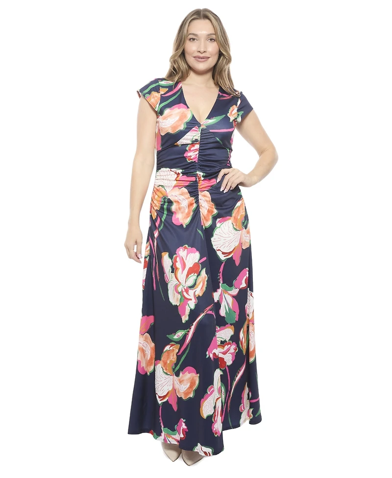 24seven Comfort Apparel Women's Floral V-Neck Cap Sleeve Ruched Front Maxi Length Dress