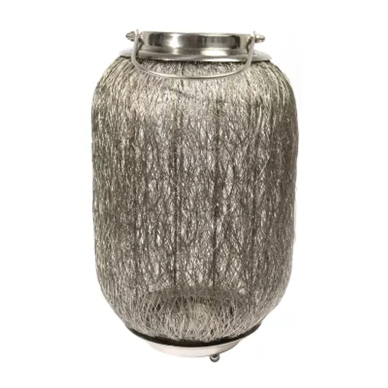 This sleek and modern huge hurricane lantern features a silver colored wire woven and textured design