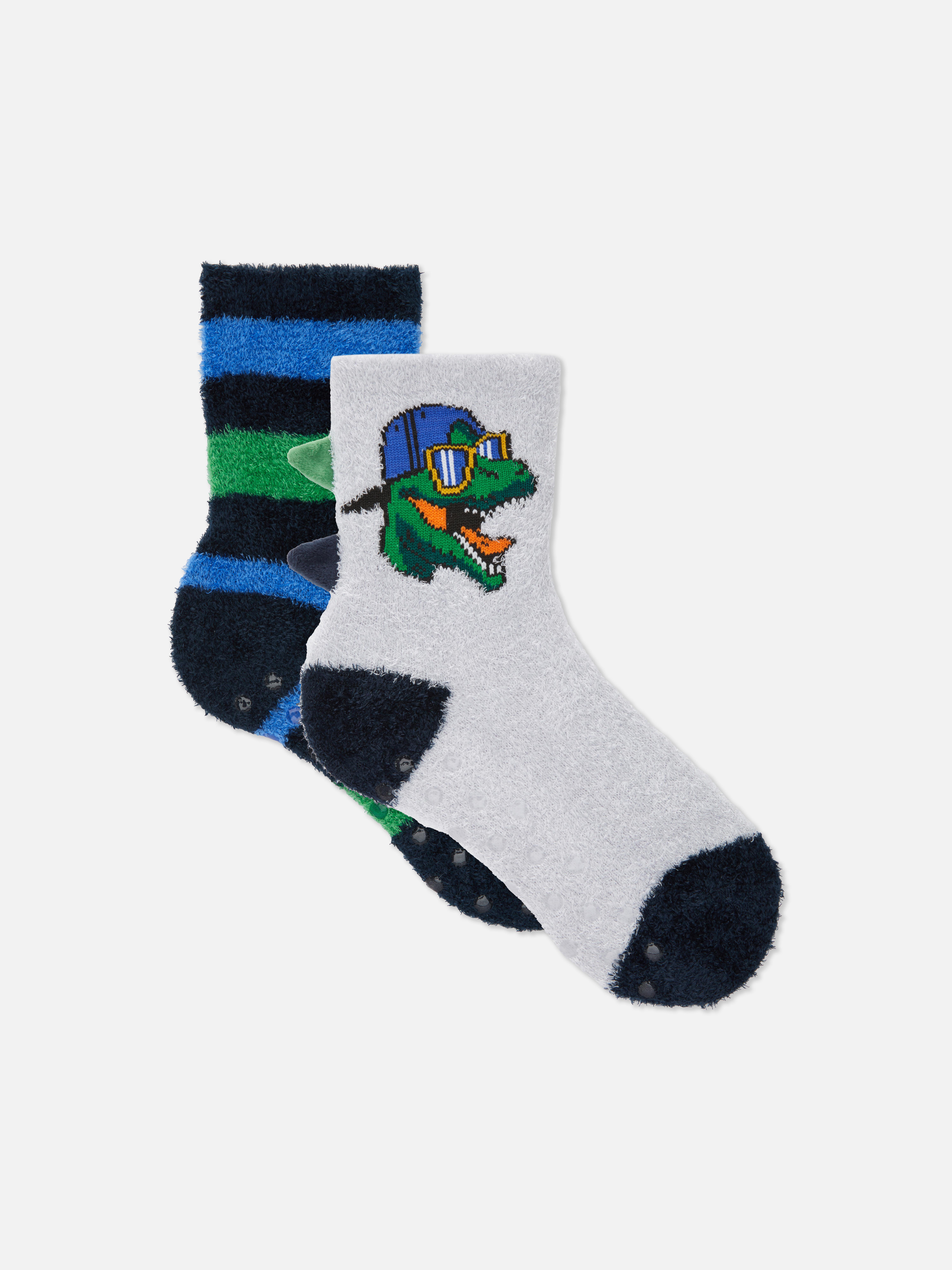 Two pairs of fluffy dinosaur socks with dot grip soles