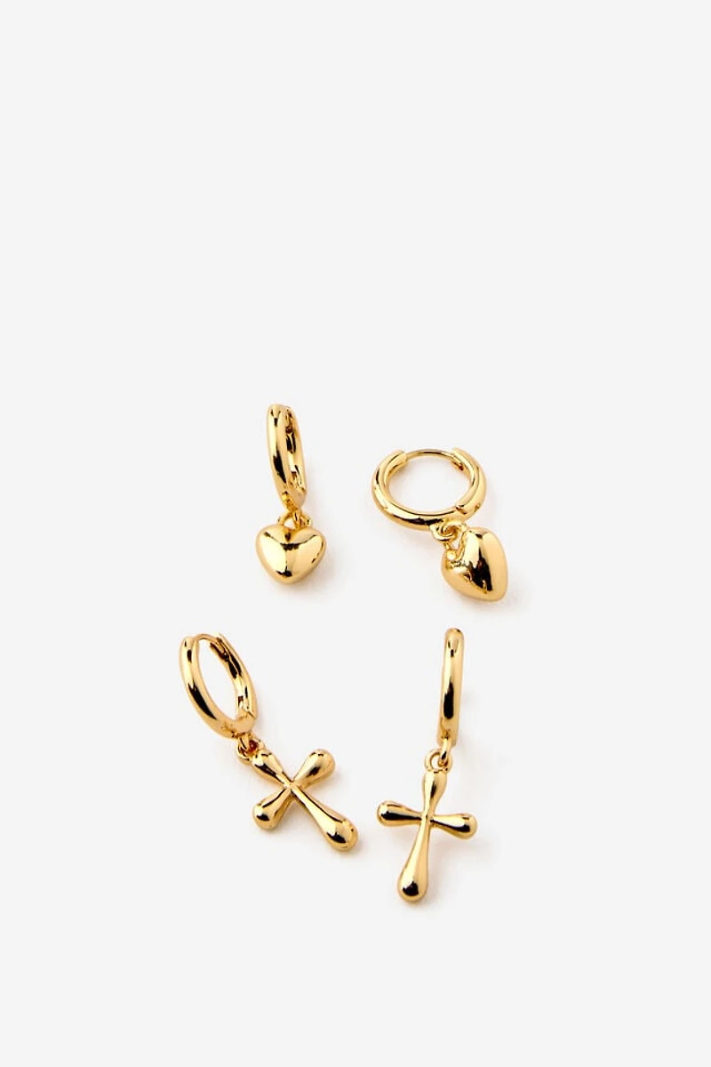 Comfort meets style. The 2Pk Mid Earring features a two-pack of gold-plated huggie hoops with puffy heart and cross details. Diamante accents add a touch of sparkle, while the small hoop style sits close to the ear for everyday wear. Style solo or stack with other favourites.