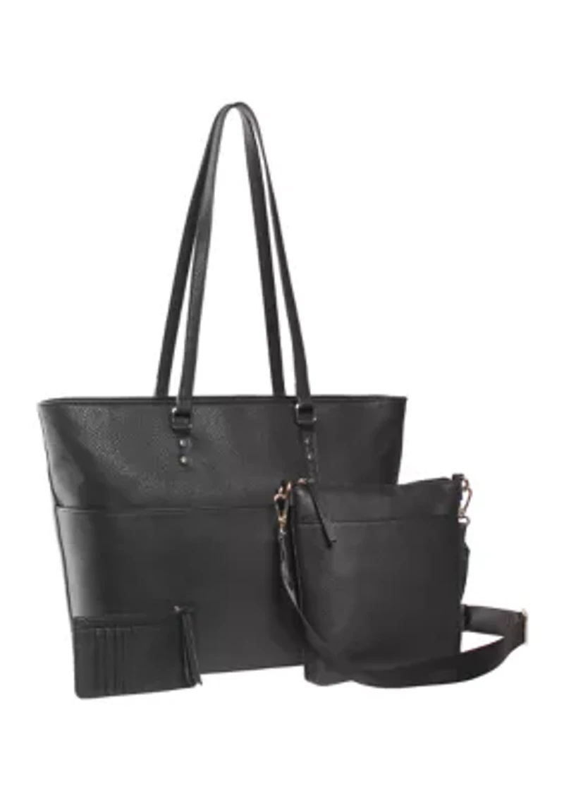 Refresh your handbag collection with this 3-in-1 tote from Kim Rogers®. 3-piece set Shoulder strap with 12.5" drop Interior: zip pocket, slip pockets Imported Belk Exclusive Product Specifications Tote: 17" x 5.5" x 11" Material & Care Polyurethane Clean with a soft cloth