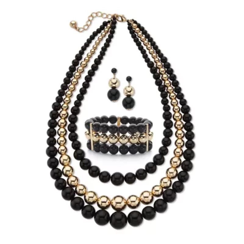 You'll catch all the attention with this glowing 3-piece set. Featuring a triple-strand beaded necklace in graduated sizes, it's a show stopper. Complemented by matching drop earrings and a 7" triple-strand, stretch bracelet, you'll love the way you shine in this set. Necklace is 16 1/2" -19 1/2" length. Goldtone and blacktone.Main Stone: 1 Round Buff Top Cut Black Bead, 17 mm x 17 mmAccent Stone: 271 BeadsNecklace: 43 mm wide x 16.5 inches long x 17 mm high, plus 3 inch extension; Earrings: 13.5 mm wide x 36 mm long x 13.5 mm high; Bracelet: 30 mm wide x 7.5 inches long x 10 mm highIncludes gift box and drawstring pouchNecklace Dimensions: 43 mm wide x 16.5 inches long x 17 mm high, plus 3 inch extension, Earrings Dimensions: 13.5 mm wide x 36 mm long x 13.5 mm high, Bracelet Dimensions: 30 mm wide x 7.5 inches long x 10 mm highIncludes gift box and drawstring pouch 4 Lobster closure, 274 Polished finish Warranty available China Imported Product Specifications 2.36 in x 16.5 in x 1.69 in, 16.5" length Material & Care Gold-Tone Metal, Gold-Tone Clean with a soft cloth.