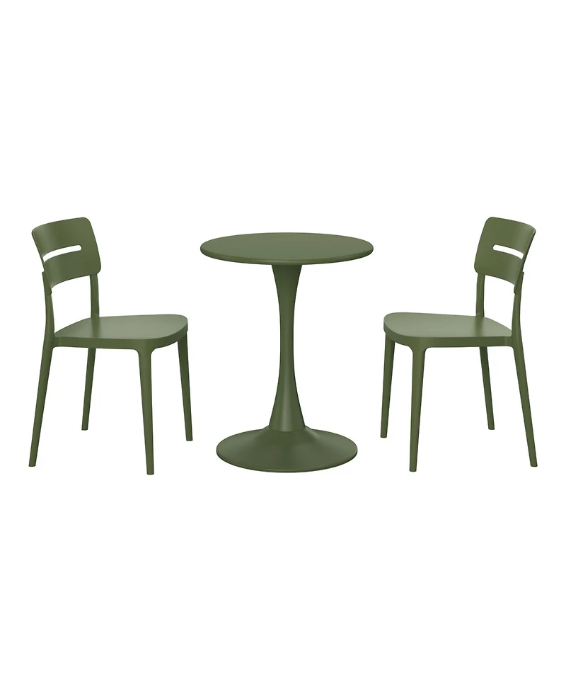 Elevate your outdoor gatherings with this two person dining table set. The round dining table, crafted from a durable metal material has a rust-resistant e-coating that ensures the tables longevity and has a wide flat base to reduce wobbling and promotes stability. Complementing the table are two stackable patio chairs, designed for space-conscious living. Made from Uv-resistant polypropylene resin, these lightweight chairs allow for effortless rearrangement, adapting to your evolving patio aesthetic. The patio dining chairs arched curved backrest offers a more comfortable design and the open backrest promotes better airflow to keep you cool during the warmer days. Enjoy instant gratification with the fully assembled chairs, while the table's assembly allows for quick setup, making it the perfect centerpiece for your outdoor retreat ensuring this 3-piece round patio dining table set for 2 is the perfect set for your patio this season.