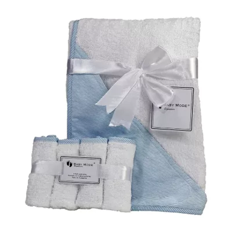 This 5 piece gift set for baby will be useful, practical, warm and soft. The terry cloth hooded baby towel will wrap your baby in warmth and comfort. Matching 4 piece wash cloths are super absorbent and soft. Soft thirsty looped terry cloth is trimmed with striped piping. Bath towel measures a large 30 inches by 30 inches and keeps baby dry and warm while keeping mom dry, too. 4 Matching wash cloths measure 10 inches by 10 inches square. Available in blue, pink or gray.