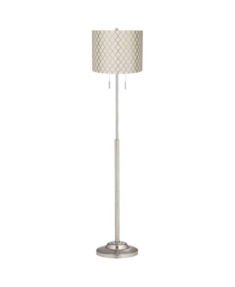 Update your living space with the help of this brushed nickel finish floor lamp. The design is crafted from metal, and has a chic contemporary look that's paired with a beautiful off-white fabric shade with an embroidered hourglass pattern. It comes with twin pull chains that rev up the style factor and make it easy to control the light output.