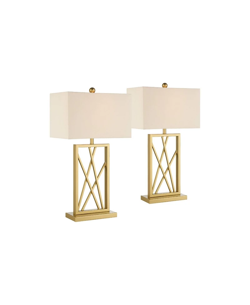 Elegant gold lines in a box-shape design create an intriguing open pattern in this set of two Claudia contemporary table lamps. Bring a crisp vibe and modern flavor to a living room or entryway with lamps inspired by clean artistry. A white box lamp shade and brass finish complete the look of each stellar lamp. Choose these lamps for placement on nightstands, end tables, or consoles.