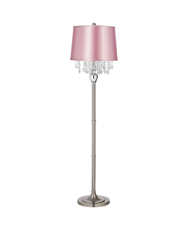 Add eye-catching appeal to your favorite room with our elegant crystal floor lamp from the 360 Lighting brand. The design features short and long strings of crystal for dramatic sparkle. A chrome finish font on the column adds a jewelry-like touch. Base, column and accents are in a satin steel finish. On-off step switch for easy lighting control. Includes a pale pink satin fabric drum shade with silver piping trim detail.