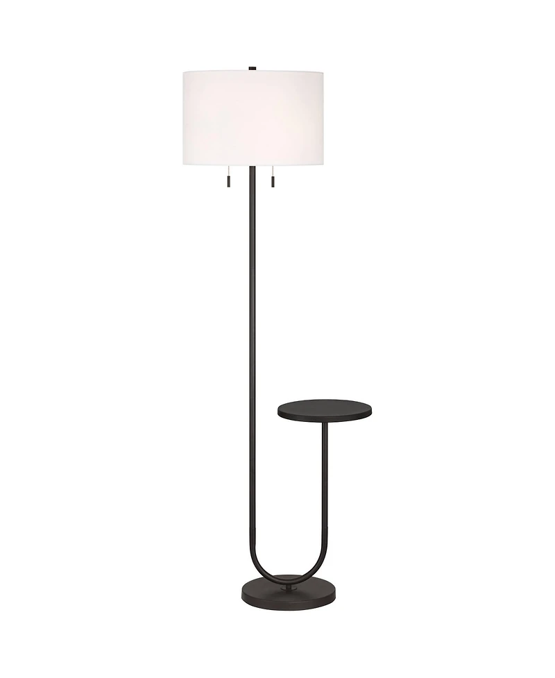 Inspired by Mid-Century design, this floor lamp offers stylish and practical lighting for your living space. The sleek metal frame comes in a bronze finish and is paired with a white fabric drum shade. An offset bottom arm supports a metal tray table. Turn the twin bulbs on and off with separate pull chain switches up top.