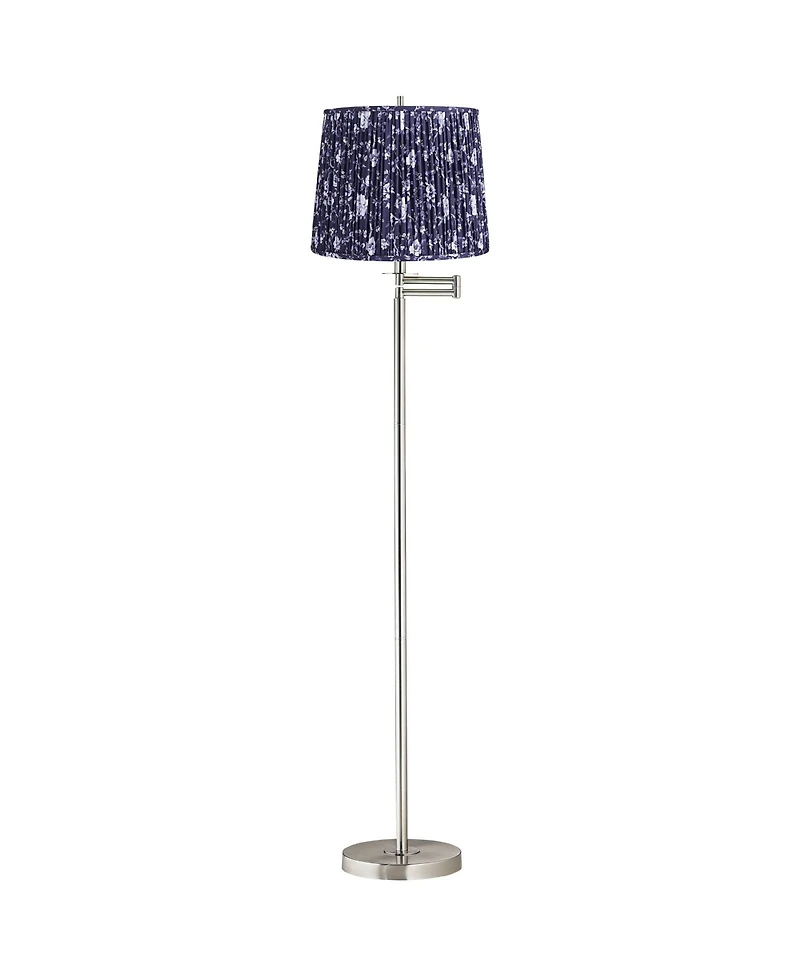 Perfect next to a sofa or arm chair, this swing arm floor lamp positions to put light just where you need it. The design features a brushed nickel finish, swing arm top, and an on-off socket switch. Includes a blue and white floral patterned fabric shade. The decorative pattern is set against a navy blue color background, and the shade has a white polystyrene liner. Comes with the correct sized harp.
