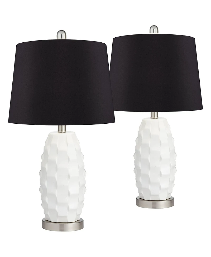 From 360 Lighting, this set of two modern coastal table lamps offers a simple and stylish look for your home. Each lamp is constructed from black finish ceramic, with a scalloped pattern on the body that adds a wavy look. Brushed nickel finish accents and black drum shades provide clean, classy enhancements to the overall design. Two energy-efficient Led bulbs are included for use, one for each lamp, with an in-line dimmer switch that allows you to control the level of lighting.