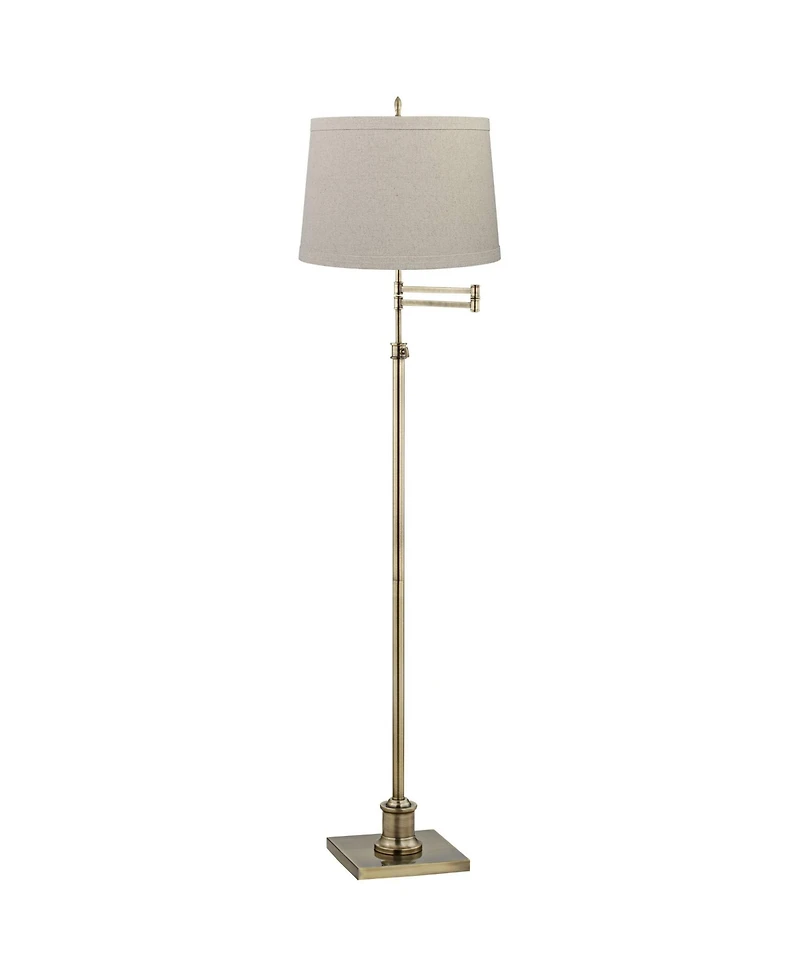 Display personal style and warm illumination with this swing arm floor lamp. The design features a thin profile base and arm. Adjust the arm and height as needed for reading and other tasks. Showcasing an antique brass finish, this chic floor lamp is topped with a designer burlap drum lamp shade.