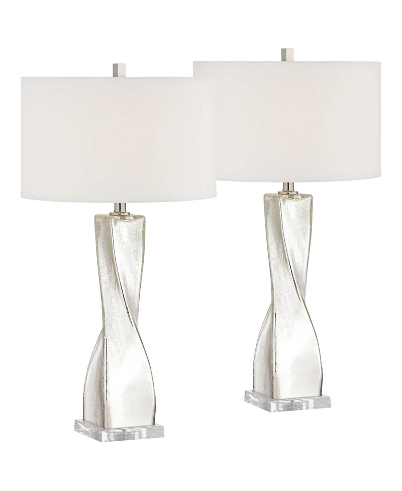 Enjoy the elegant silhouette of these twist Mercury glass table lamps. They are styled in an elegant crackle silver finish over Mercury glass construction. They sit on a clear acrylic base and are topped with cool white faux silk fabric drum shades. These lamps will add a touch of refinement to your living room, bedroom, or home office environment.