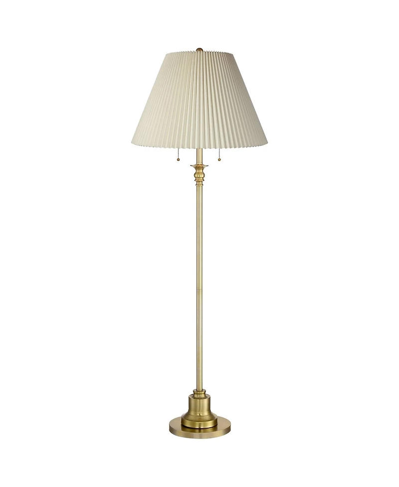The traditional style of this designer floor lamp is sure to add a simple elegance to your living space. From the 360 Lighting brand, the lamp comes with a warm brass finish and an beige fabric pleated lamp shade. It has a timeless design sure to gracefully blend in to your classic-looking home. The twin pull chains make it easy to turn each light on and off.