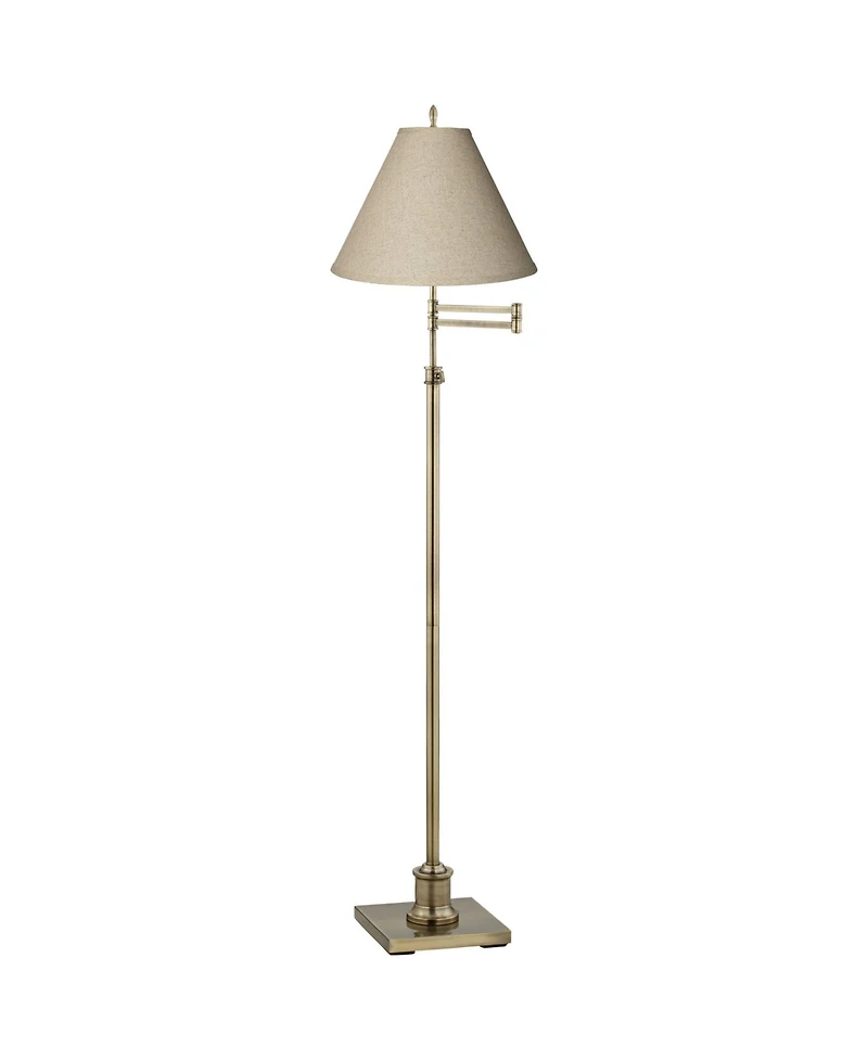 Wearing an antique brass finish, this transitional floor lamp maintains timeless style. Its swing arm design and adjustable height allow it to cater to your ideal level of comfort and convenience. Topped with a fine burlap cotton blend empire shade, this modern lamp is as chic as it is functional.
