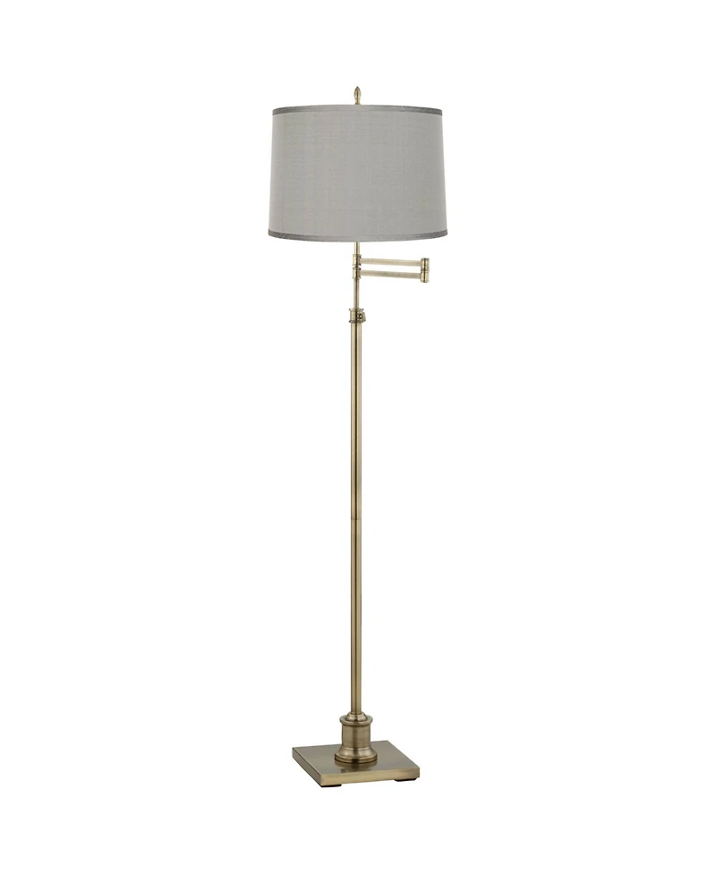Featuring a thin profile base, this chic floor lamp's adjustable arm and height come in handy for reading and other tasks. Its platinum gray dupioni silk designer shade is modernly attractive. Tastefully accent your decor with this contemporary floor lamp's antique brass finish.