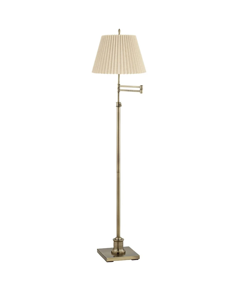 Add style and light with this swing arm floor lamp. The design features a thin profile base and arm. Adjust the arm as needed for reading or other tasks. The lamp can also be adjusted up and down as desired. The lamp comes in an antique brass finish and is topped with a beige fabric lamp shade with pleated detailing.