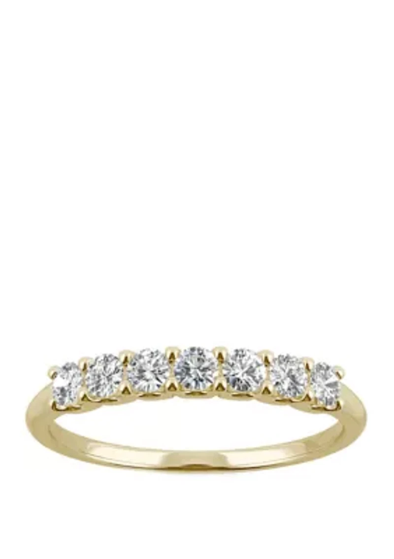 Simple, chic, classic. This 14K Yellow Gold anniversary band by Charles & Colvard® holds a row of petite Moissanite accent stones in a shared prong setting with a total diamond equivalent weight of 3/8-carat. It's perfect for stacking or as a sweet solo statement. 7 Moissanite Color rating: G, H, I Clarity rating: SI-I2 Slip-on Prong setting Comfort fit Polished finish Lifetime liability warranty Imported Product Specifications 2.67 mm L x 2.67 mm W x 3.1 mm H 3/8 ct. t.w. Moissanite Material & Care 14K Yellow Gold Clean with a soft cloth