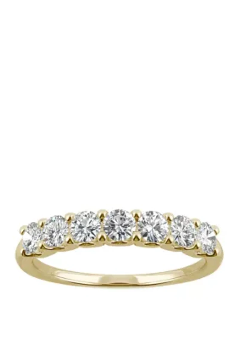 Simple, chic, classic. This 14K Yellow Gold anniversary band holds a row of petite Moissanite accent stones in a shared prong setting with a total diamond equivalent weight of 3/8-carat. It's perfect for stacking, or as a sweet solo statement. 7 Moissanite Color rating: G, H, I Clarity rating: SI-I2 Slip-on Prong setting Comfort fit Polished finish Lifetime liability warranty Imported Product Specifications 3.13 mm L x 2.31 mm W x 3.4 mm H 3/8 ct. t.w. Moissanite Material & Care 14K Yellow Gold Clean with a soft cloth