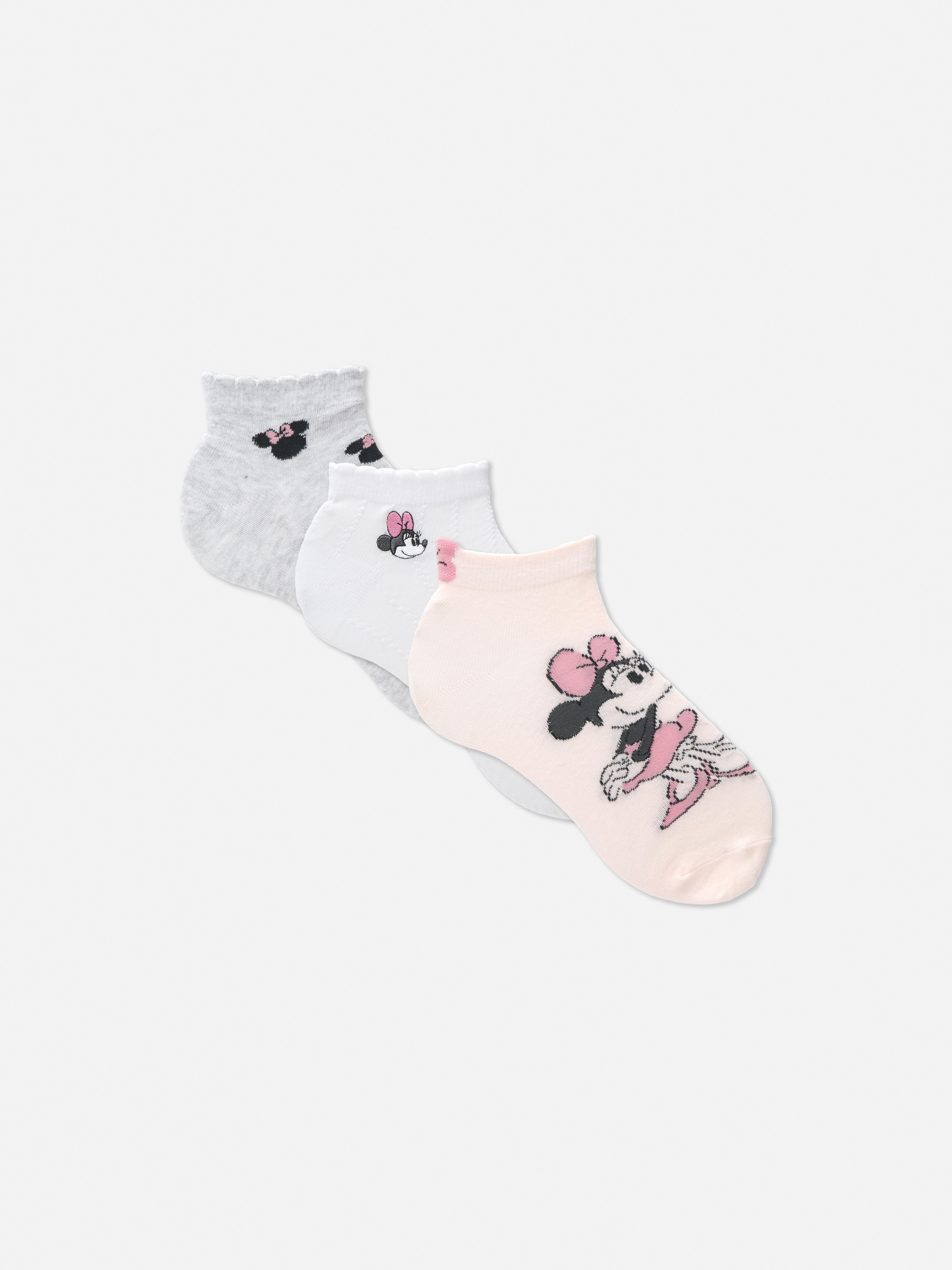A 3-pack of cotton-rich Minnie Mouse anke socks in grey, white, and pink