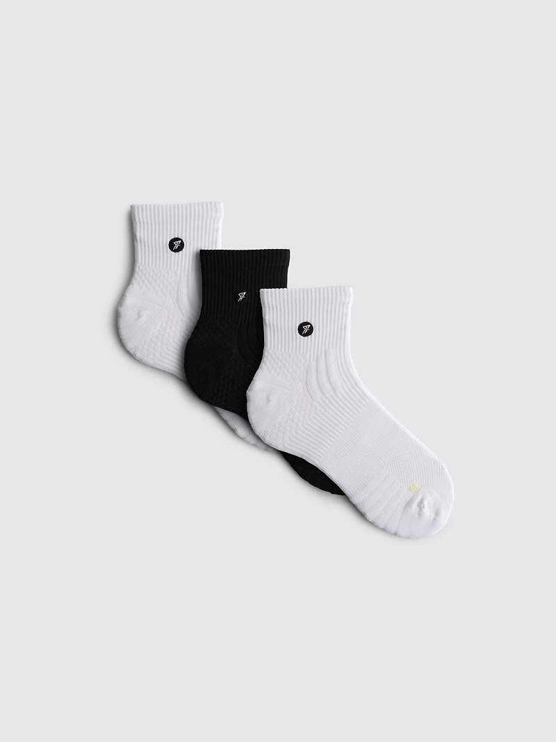A 3 pack of microfiber active socks in white and black with ribbed cuffs, in a quarter crew length