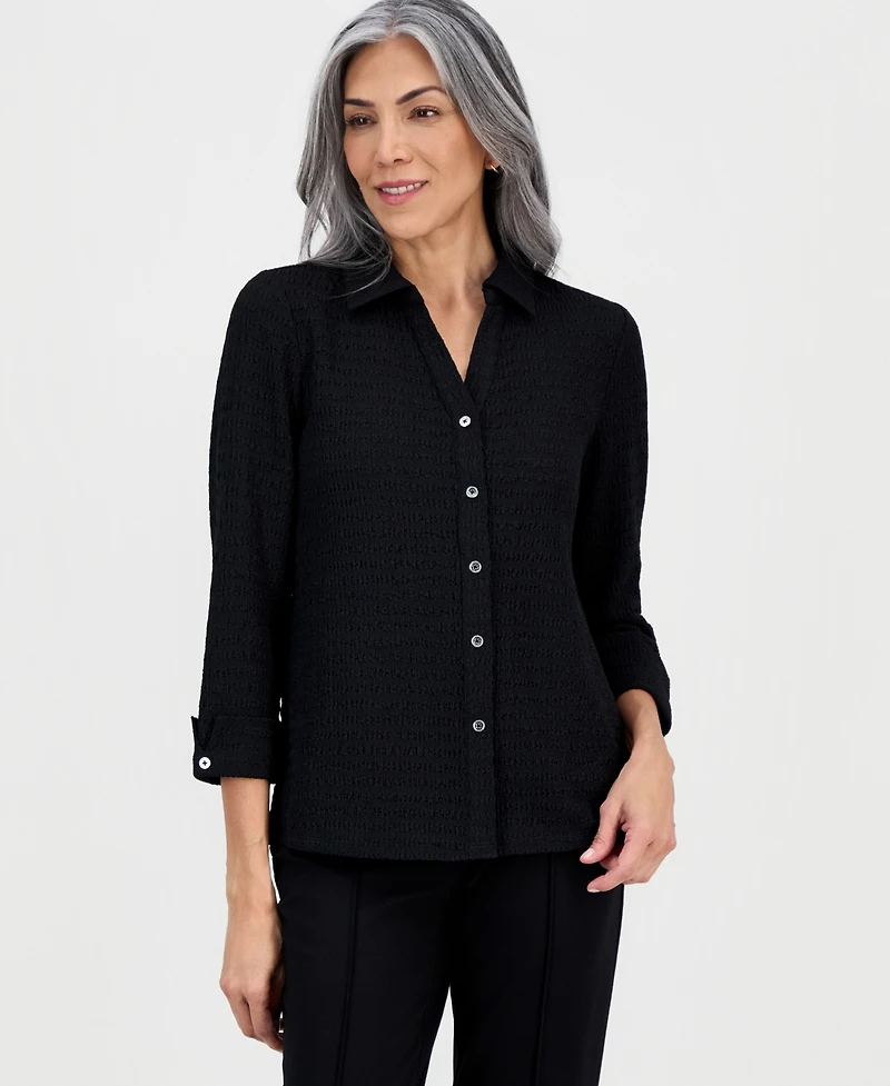 This 3-quarter button-front top features split cuffs, adding a stylish and refined detail to the design.