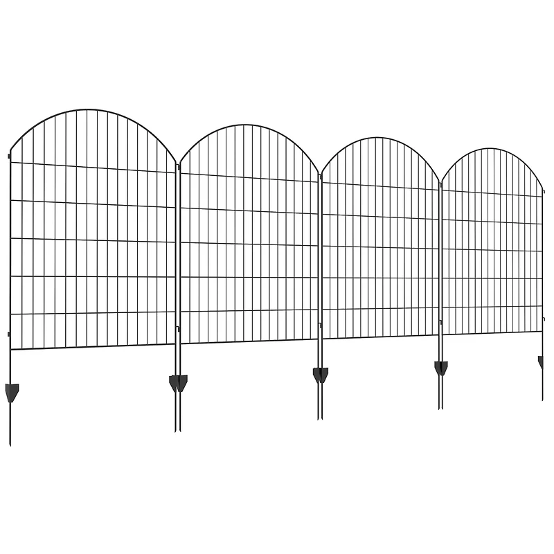 Decorative garden fence panels with black arches, available in 4-panel sets (34.75" x 43.25" each). Customizable steel panels can be bent into various shapes and used as garden edging or animal barriers. Easy installation with interlocking design and included stakes.