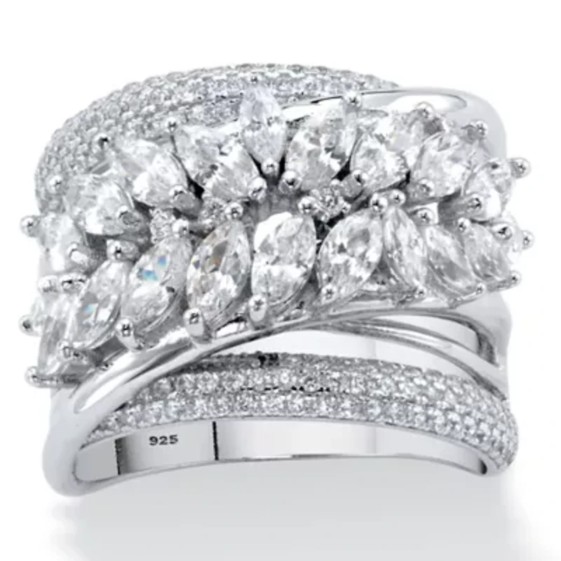 This elegant crossover ring shimmers with sophistication, whispering of contemporary style with traditional undertones. Diagonal rows of marquise-cut cubic zirconia are richly pronged in platinum-plated sterling silver, with round accents crusted along the outer bands. 4.18 carats T.W. Sizes 6-10. We recommend that you order one size up for this style.Main Stone: 16 Marquise Faceted Cut Cubic Zirconias, 2.40 carats total weight, 5 mm x 2.5 mmAccent Stone: 125 Cubic Zirconias 1.78 cttwPlatinum-Plated Sterling Silver; Contains 8.90 grams of Sterling SilverMeasures: 21 mm wide x 17 mm long x 6 mm high; Shank Width: 2.0 mm wideIncludes gift box and drawstring pouchPlatinum-Plated Sterling SilverContains 8.90 grams of Sterling SilverShank Width: 2.0 mm wideDimensions: 21 mm wide x 17 mm long x 6 mm highIncludes gift box and drawstring pouch 141 Polished finish Warranty available China Imported Product Specifications 1.06 in x 0.67 in x 0.83 in 4.1770000000000005 Material & Care Metal, Sterling silver Clean with a soft cloth.