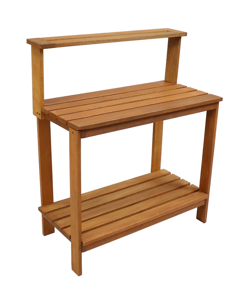 Prepare outdoor or indoor plants for planting with this meranti wooden potting bench with an added shelf. This handy piece of furniture is constructed of meranti wood with a beautiful teak oil finish, adding undeniable natural beauty and increased resistance to the outdoor elements. Still, with the wooden construction, make sure to cover or bring this planter box bench indoors during harsh weather conditions to ensure longevity. This potting bench provides a great place to prep and maintain plants and seedlings. Plus, everything needed to put this potting table together is in the box, including the tools and hardware so it can be set up right away. This versatile potting bench is great for the greenhouse, garage, mudroom and other places.