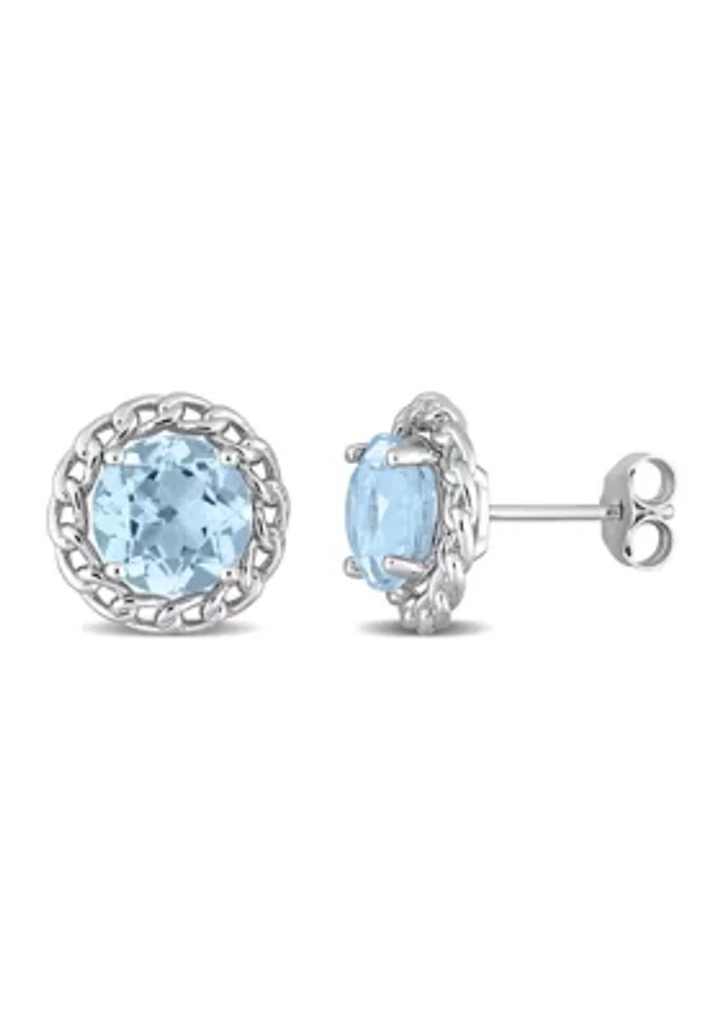Beautiful and timeless, these Sky Blue Topaz Halo Link Stud Earrings are the perfect addition to any jewelry collection. Crafted in lustrous sterling silver they feature two round-cut, prong-set flickering sky blue topaz gemstones (8 x 8mm) at the center with a halo of link braided design. Enhanced with a high polish finish, these alluring earrings are secured with butterfly closures. These stylish gemstone stud earrings gives a look of lavish style ideally suited to formal events. Post back, 2 sky blue topaz Polished finish Prong setting Warranty available, 60 Days China Imported Belk Exclusive Product Specifications 12.3mm Height x 12.3mm Width 4.7 ct. t.g.w. sky blue topaz Material & Care Sterling silver Metal, Sterling silver Clean with a soft cloth.