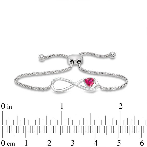 Present the object of your loving affection with this pretty fashion bolo bracelet. Crafted in sterling silver, this charming look is centered with a sculpted infinity symbol-shaped outline embellished with glistening lab-created white sapphires. A 5. 0mm heart-shaped lab-created bright red ruby in the top corner adds a vibrant pop of color to the style. Buffed to a brilliant luster, this wheat chain bracelet adjusts up to 8. 5 inches in length and secures with a bolo clasp.