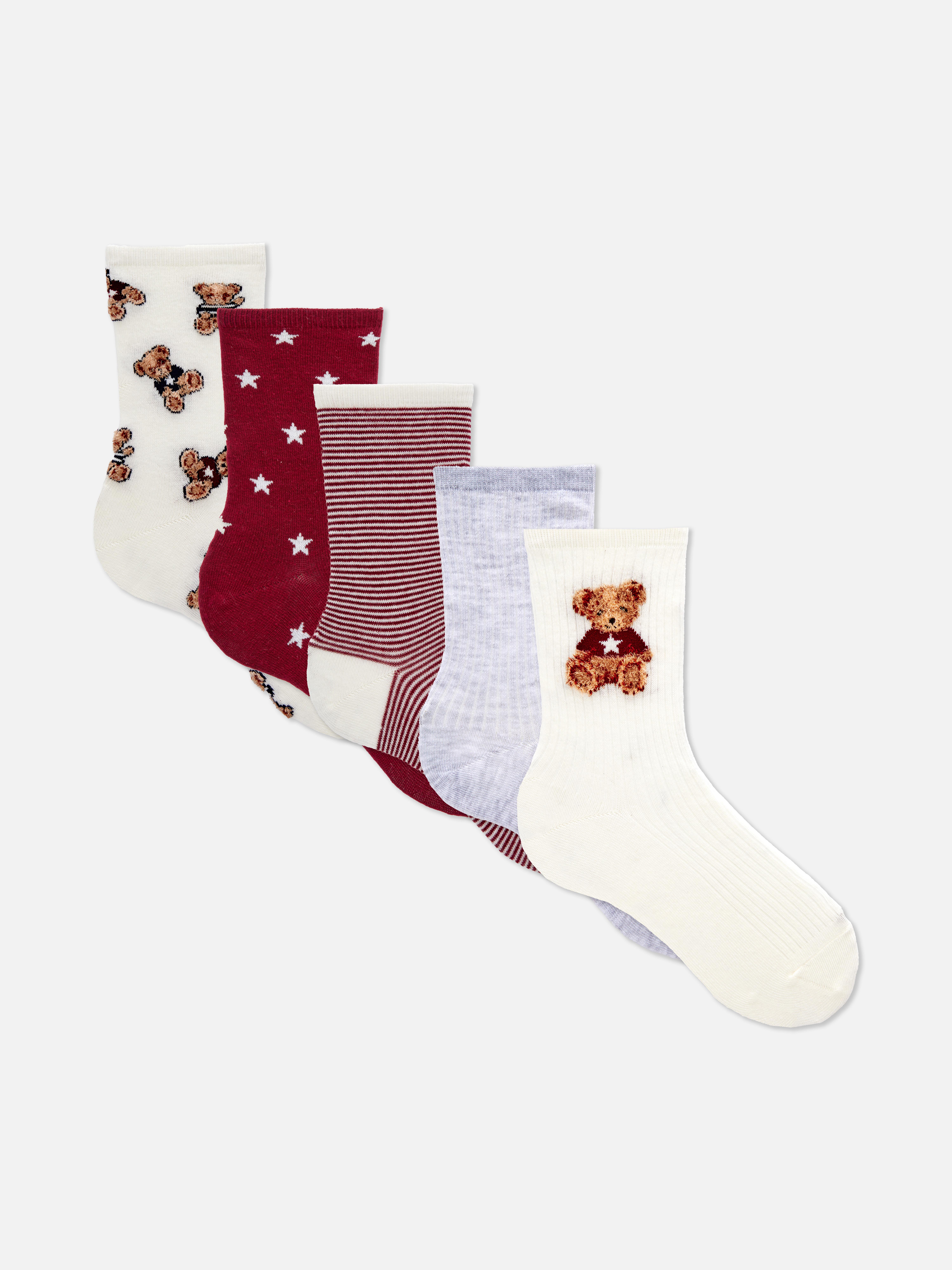 A 5-pack of cotton blend socks with bears, stripe,s and stars