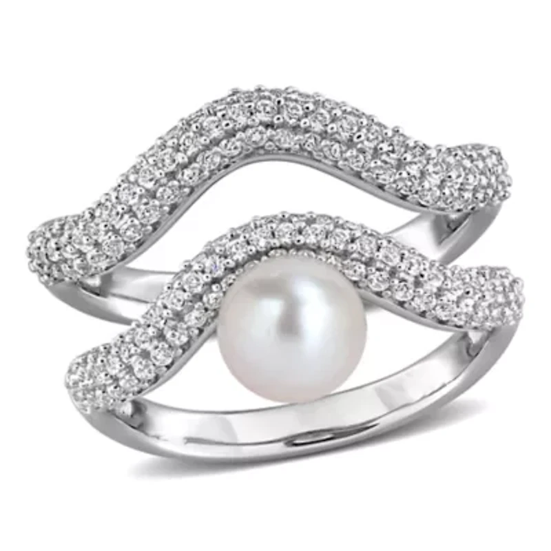 6-6.5mm Freshwater Cultured Pearl & White Topaz Modern Curved Ring Set Sterling Silver