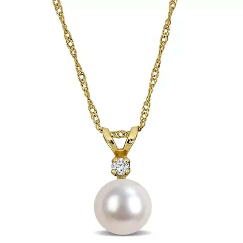 Elegant and refined, this pendant necklace features a lustrous cultured pearl accented with sparkling diamonds, suspended from a 14k yellow gold chain. Its classic design balances timeless sophistication with subtle brilliance, creating a piece that enhances any outfit. Perfect for everyday wear or adding a graceful touch to special occasions, this necklace is a versatile and enduring symbol of elegance. Spring ring clasp, 1 diamond Color rating: H, G Clarity rating: I2-I3 Polished finish Prong setting Warranty available, 60 days Thailand Imported Belk Exclusive Product Specifications 7-mm width x 13-mm height, 17" 1/16 ct. t.w. diamond Material & Care 14K Yellow Gold Metal, Yellow Gold Clean with a soft cloth.