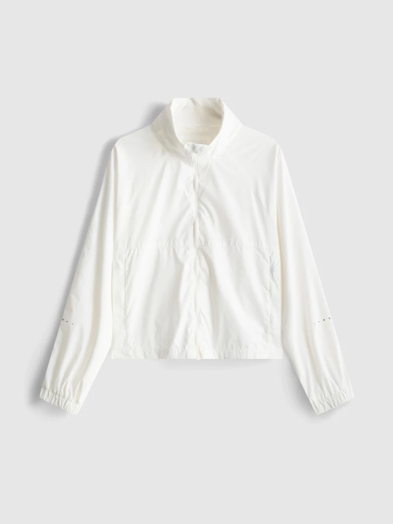 An activewear track jacket with a hood, slip pockets, and elastic cuffs
