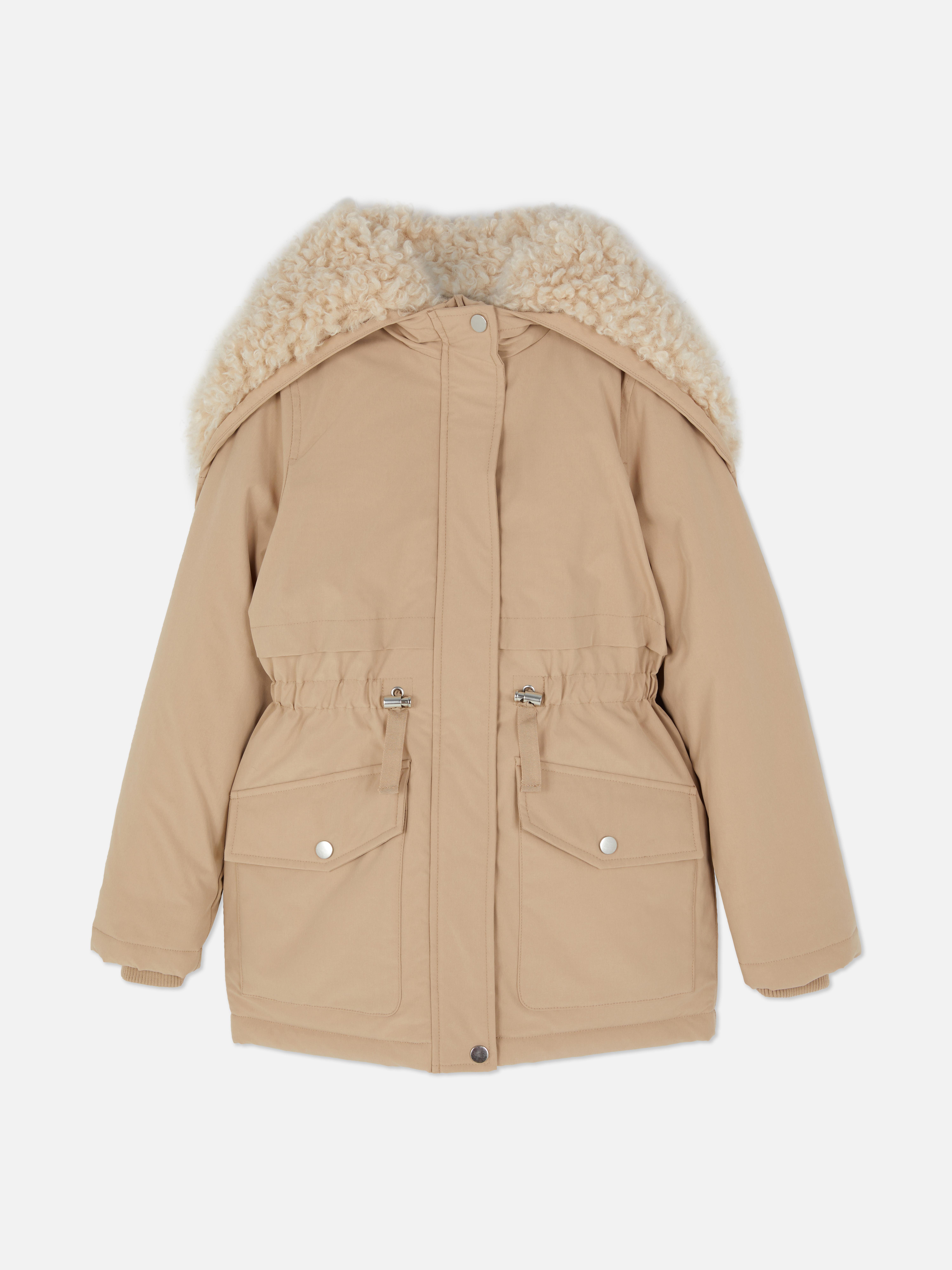 A borg-lined parka jacket with a concealed front fastening, toggle waist, and pockets