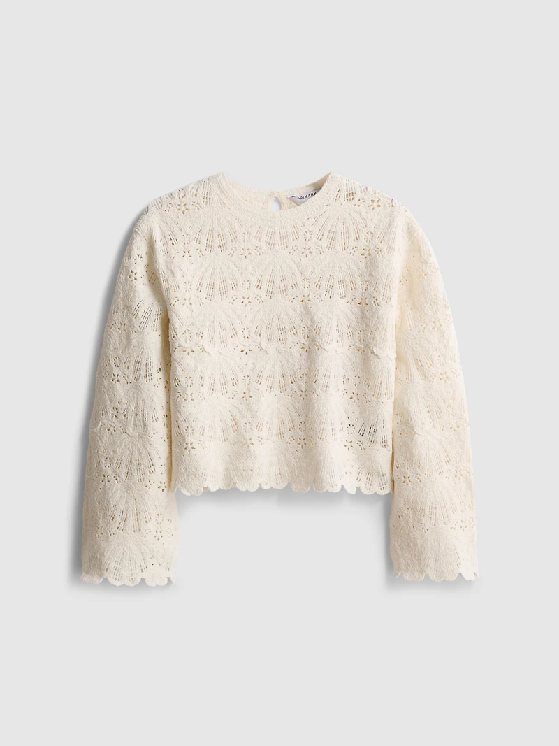 A long-sleeved crochet-style top with scalloped trims